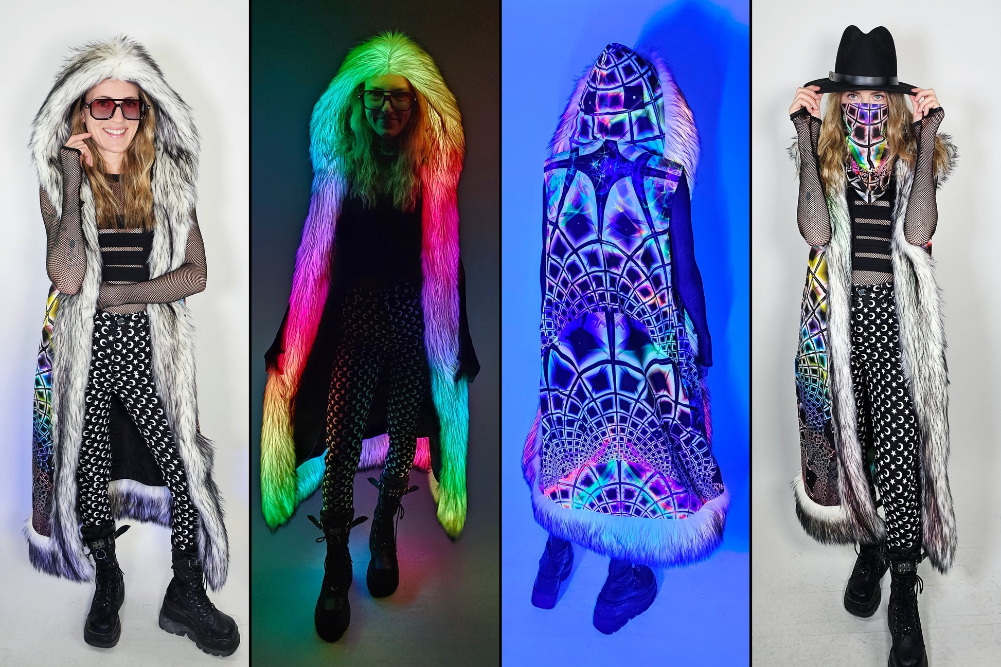 Meet our LED duster vest – a showstopper by day, a light show by night. This handmade duster features outer and lining fabrics of your choice, faux fur trim with LEDs, and a large hood.